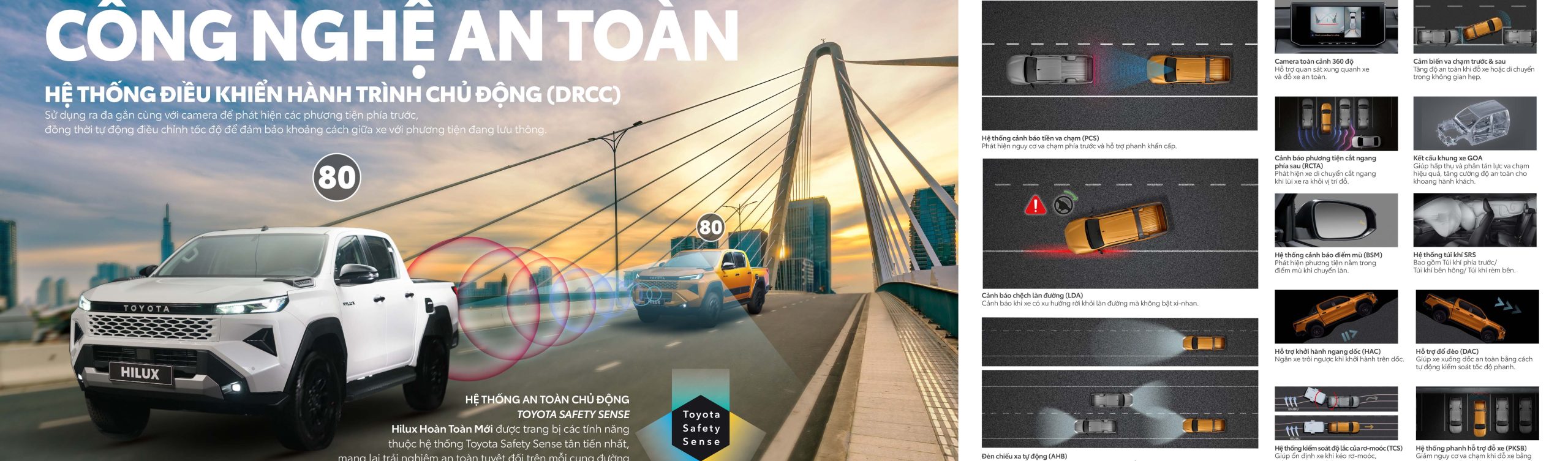 Toyota Hilux 2026 được trang bị gói an toàn TSS, bao gồm: Cảnh báo tiền va chạm, Phanh tự động khẩn cấp, Cảnh báo lệch làn & hỗ trợ giữ làn, Kiểm soát hành trình chủ động, Camera 360 độ, 7 túi khí.